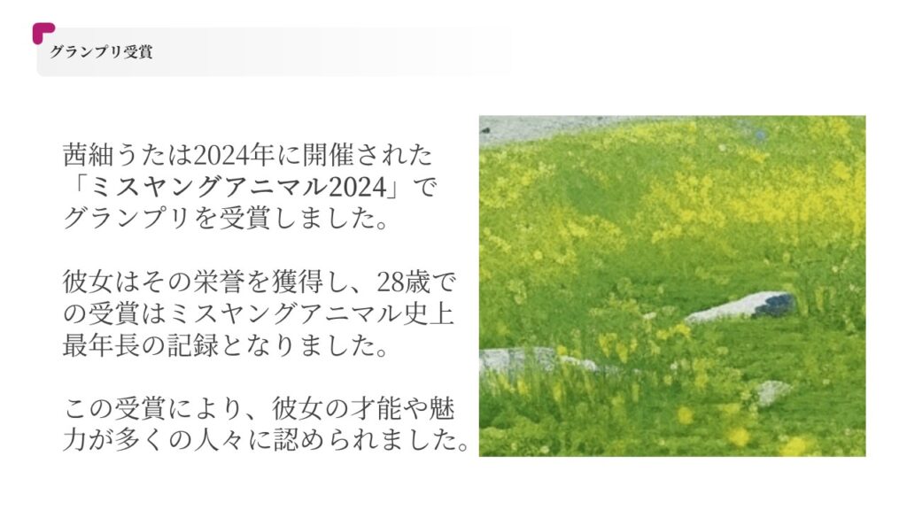 2024年には「ミスヤングアニマル2024」のグランプリに選出され、同年7月28日にその栄冠を獲得しました。