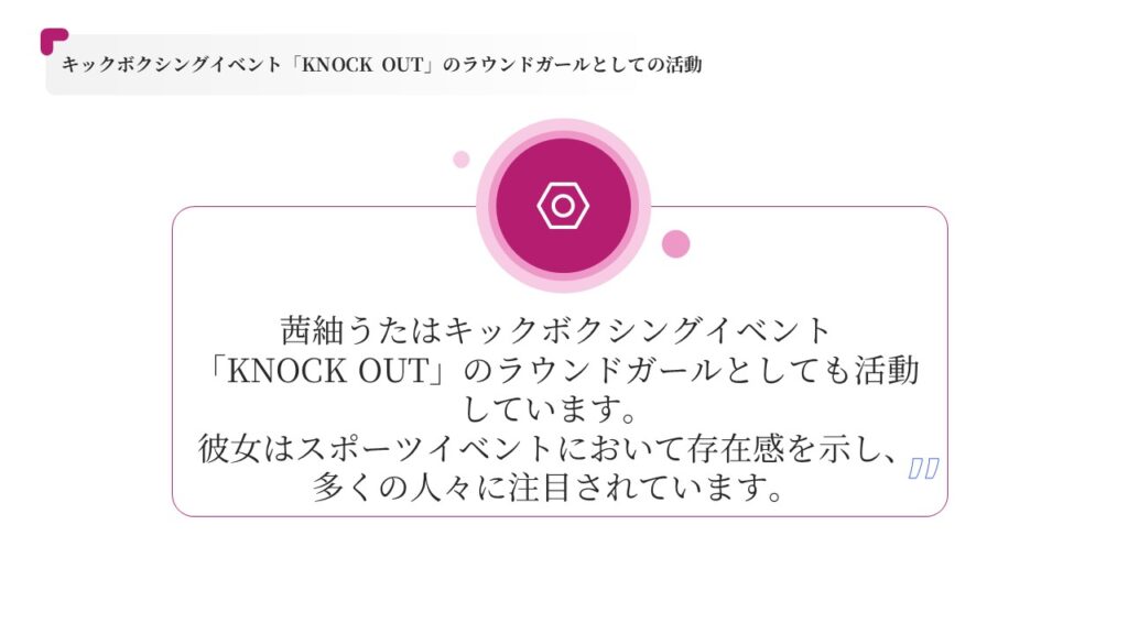 茜紬うたは、キックボクシングイベント「KNOCK OUT」のラウンドガールとしても活動しており、スポーツイベントへの出演を通じて、より幅広いファン層を獲得しています。