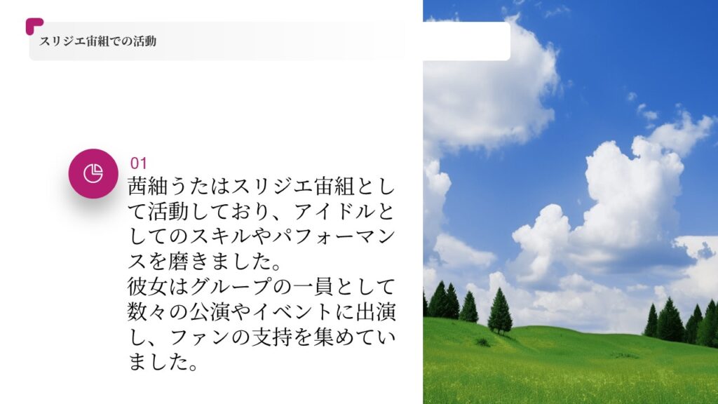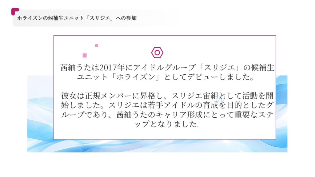 茜紬うたは2017年にアイドルグループ「スリジエ」の候補生ユニット「ホライズン」としてデビューしました。
